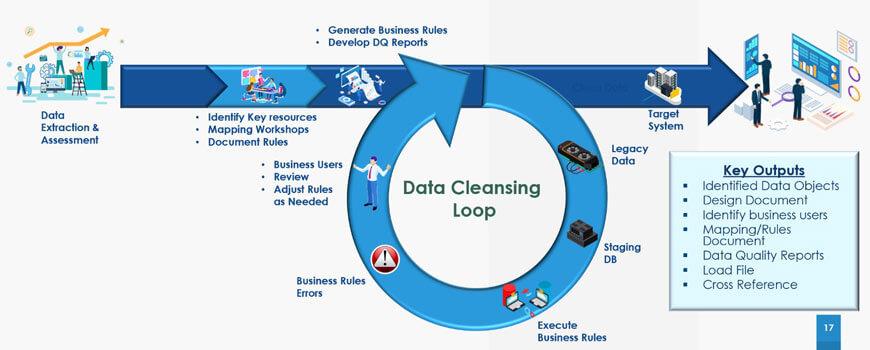 Objective of Data Migration is to ensure that the legacy data is extracted, cleansed, transformed and a data of high quality suitable for all the business use is moved to the new system.