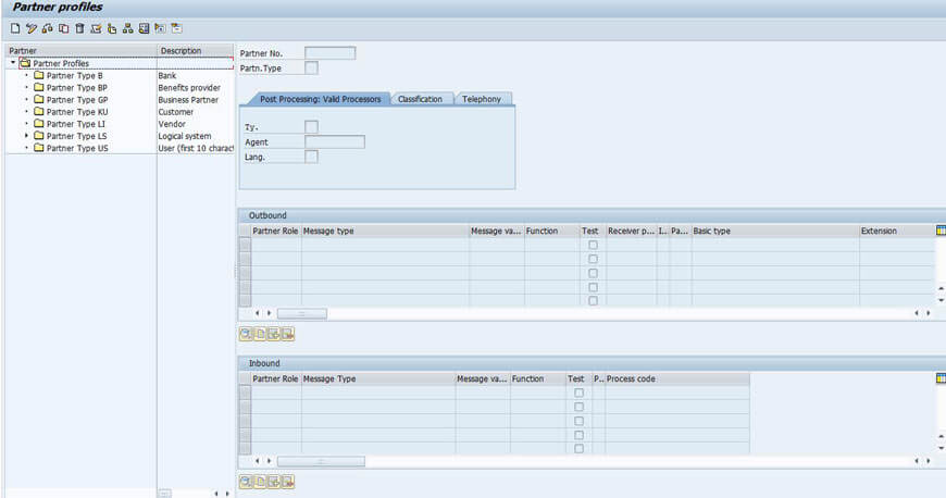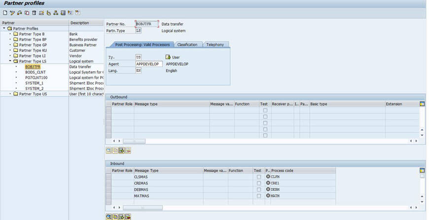 Now enter the partner number as the logical system name that we have created and partner type as LS (Logical System). In the "Post processing: Valid processors" tab give the type as "US" and agent as the user name with which we have logged on (can be taken from search help) and give the language. After entering these values click on save. Addition of inbound as well as outbound parameters will be active only after saving.