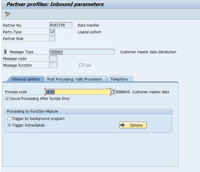 In the inbound parameters, add all the message type we have to use. For example, if we have to send the customer master data IDoc then the corresponding message type DEBMAS should be added in the inbound parameters.